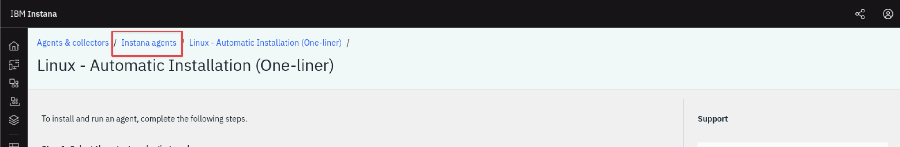 Navigate back to the Instana agent installations page by using the Instana agents breadcrumb at the top of the Linux - Automatic Installation page: