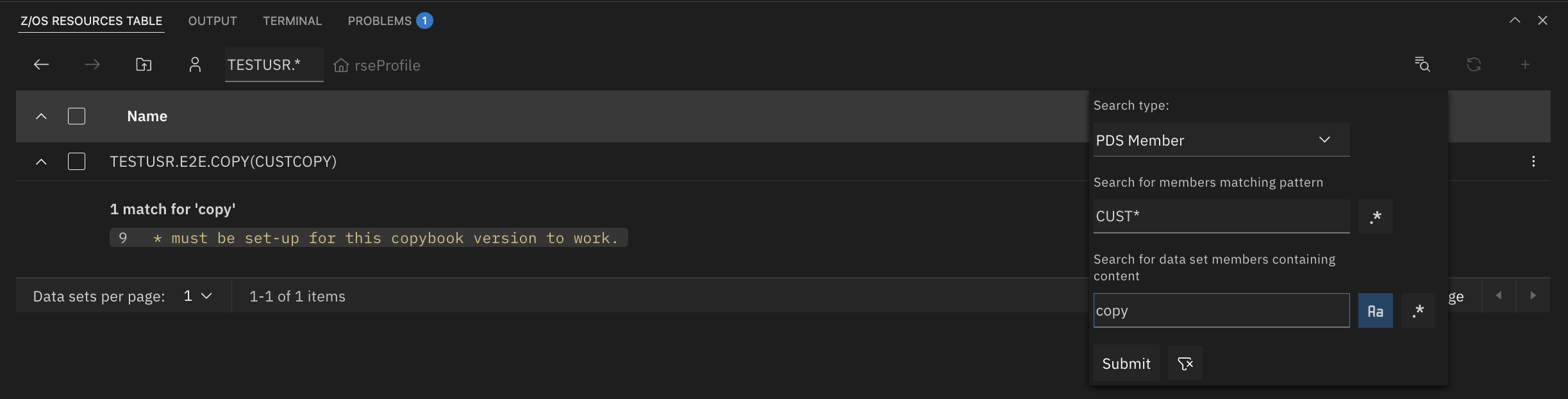 Click the Search button to open a menu that enables you to search for sequential data set content or partitioned data set members. After you submit a search, it stays active until you clear it. To clear, press the Reset button to the right of the Submit button in the search menu.