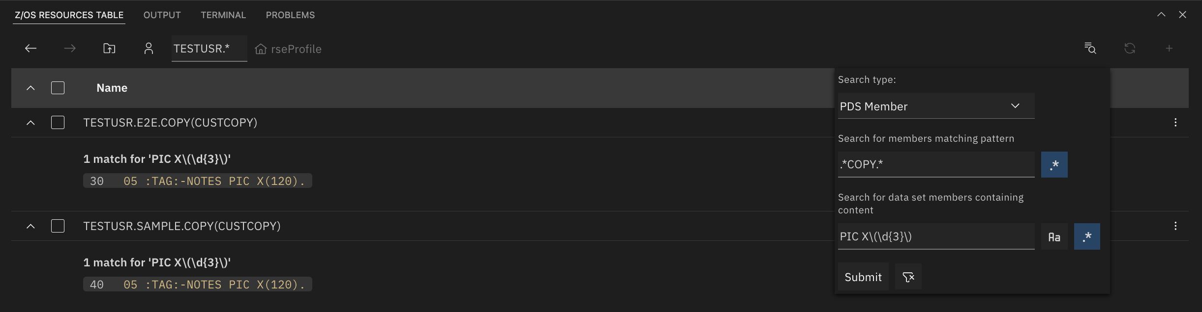 The PDS Member search supports using regular expressions for member name and content searches. The example below shows a search for members with a name that contains COPY surrounded by any number of characters. For member content, the search uses the regular expression PIC X\(\d{3}\), which finds large Picture (PIC) clauses where the number of bytes of storage is specified with three digits. The result matches strings like 01 REPORT-RECORD PIC X(132). in members with a name like CUSTCOPY.