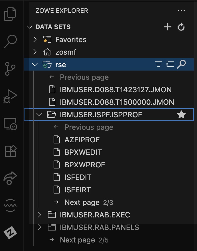 If the number of matching data sets or members exceeds the configured page size, for example 5, Zowe Explorer performs the following actions: